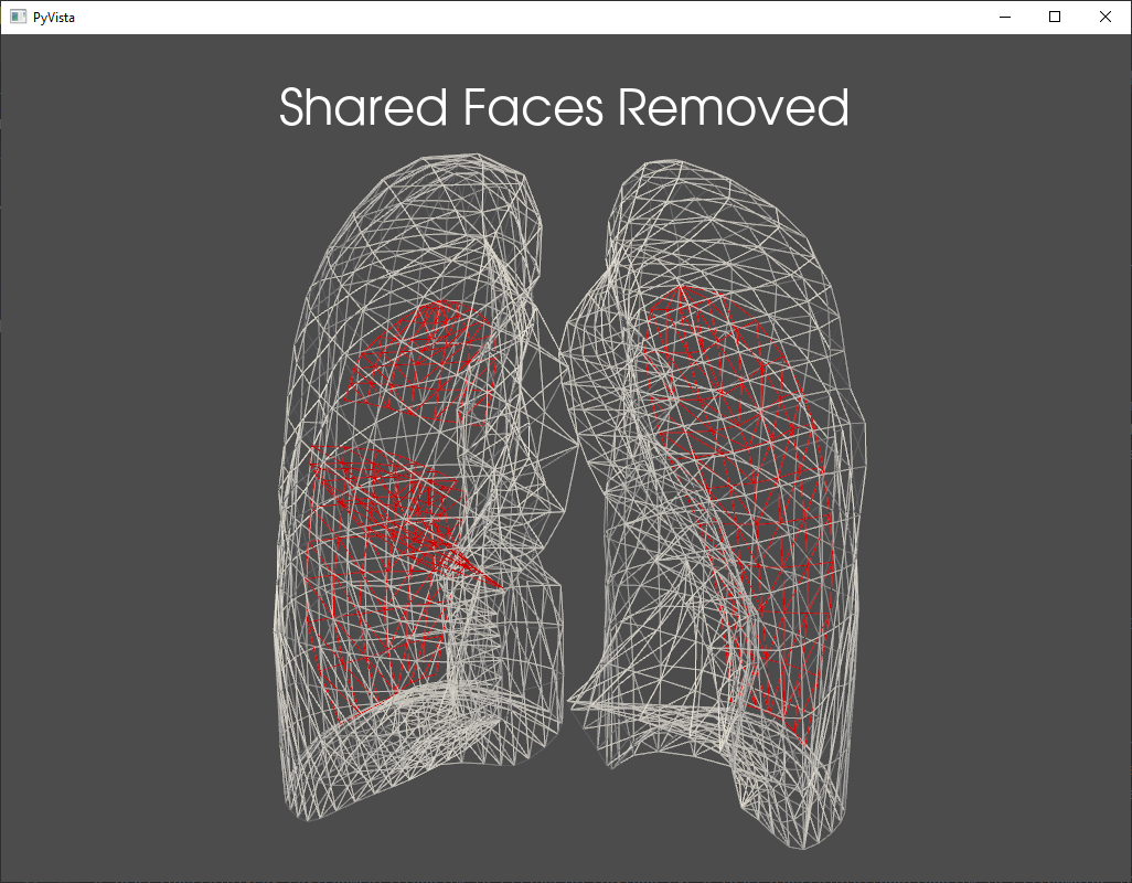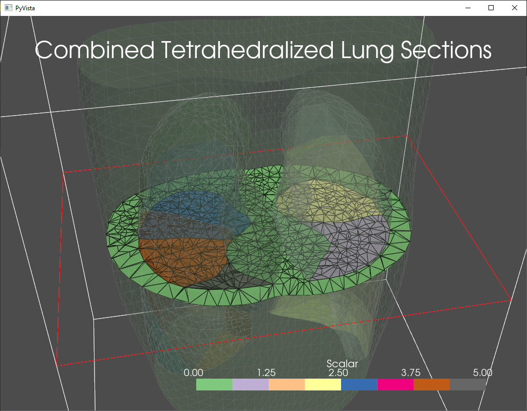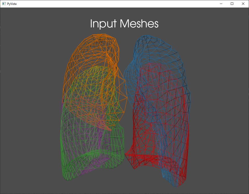 The gmsh_tetrahedralize function provides an interfaces to the gmsh package for mesh tetrahedralization. Options for tetrahedralization can be passed through the gmsh_options dict. The images below show a torso tetrahedralized with holes where lungs can be inserted (left) and a combined tetrahedral mesh where the torso had been combined with individual tetrahedralizations of the lung lobes.