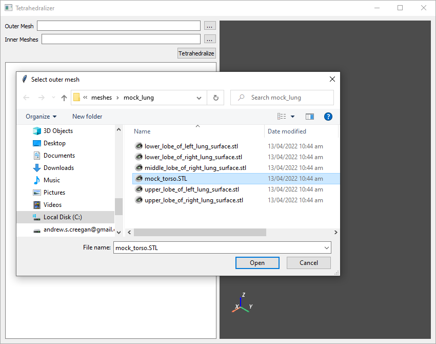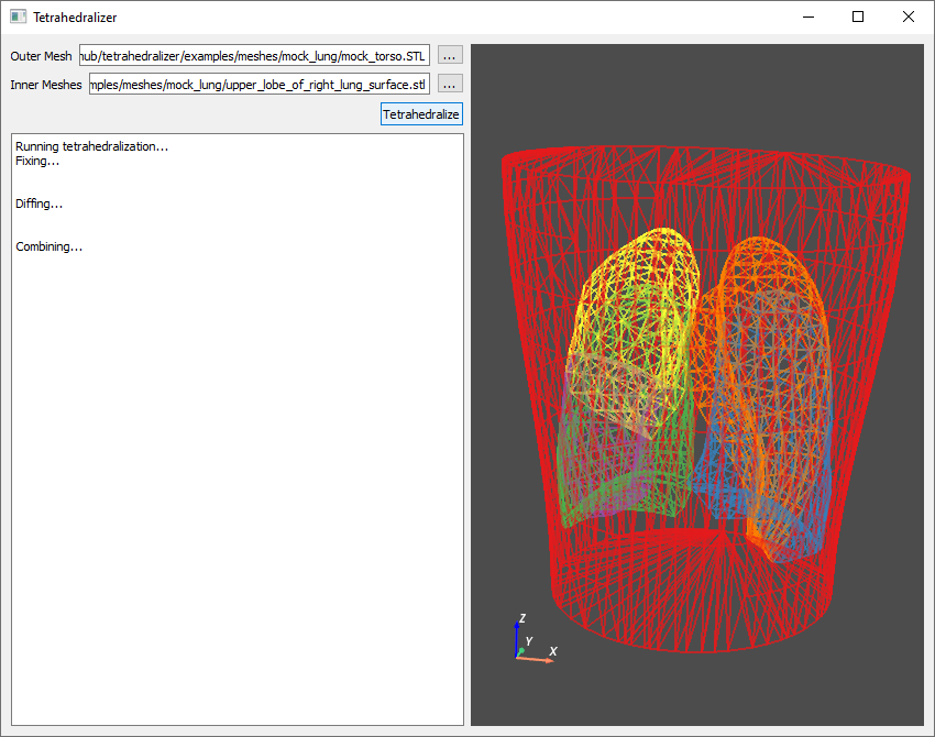 Click Tetrahedralize, and the automated process will begin, with progress displayed in the text box on the left had side of the screen. When finished, the resulting tetrahedralized mesh will be saved as a .vtu file in the output directory of the Tetrahedralizer installation: