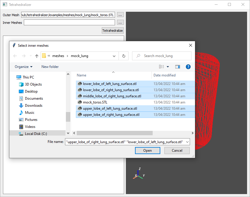 To use the Tetrahedralizer app, simply select one outer mesh, representing the outermost boundary of the desired output mesh, then select any number of inner meshes, representing the boundaries of inner sections of the output mesh: