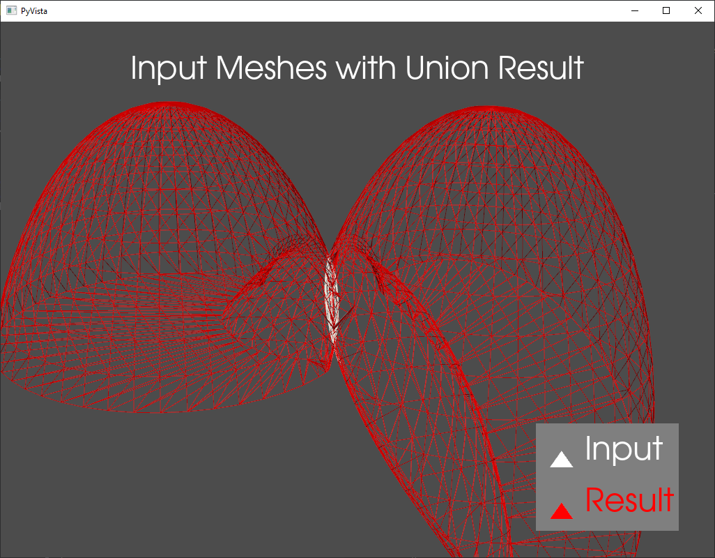 The pymeshlab_boolean function provides an interface to the boolean mesh operations in pymeshlab. Differenc, Intersection, Union, and Xor are available. This operates on a platform independent mesh representation in the form of arrays. The image below shows the boolean union between two slightly intersecting meshes.